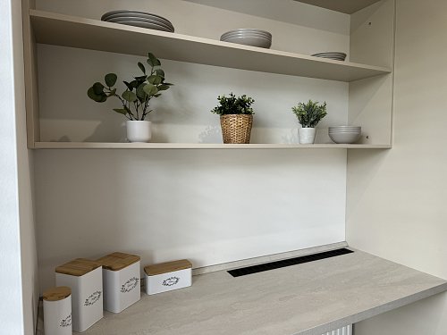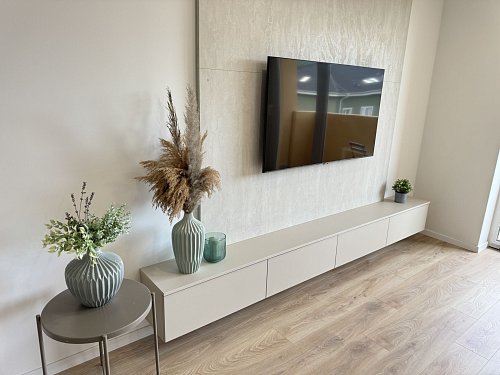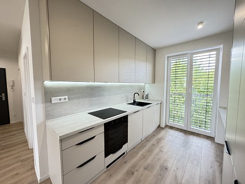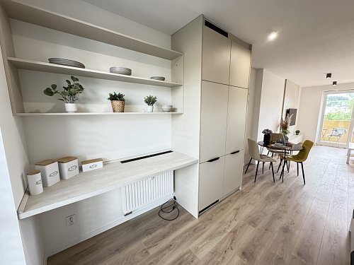 Byt zostáva kompletne zariadený vrátane novej kuchynskej linky na mieru so vstavanými spotrebičmi – rúrou na pečenie, chladničkou a umývačkou riadu. Priestranná obývacia izba s kuchyňou tvorí srdce bytu a ponúka ideálny priestor na oddych, stretnutia s priateľmi či rodinné večere. Z obývačky máte priamy vstup na veľkú loggiu, kde si môžete vychutnávať lúče slnka najmä doobeda.