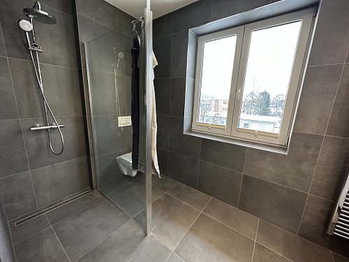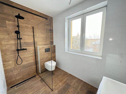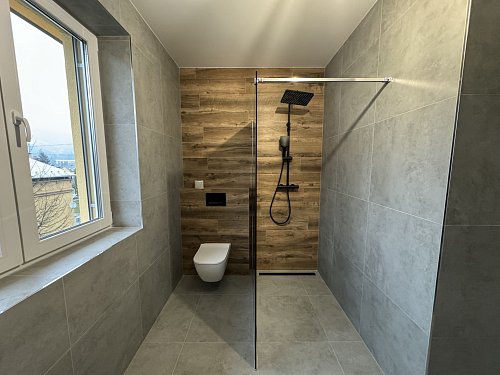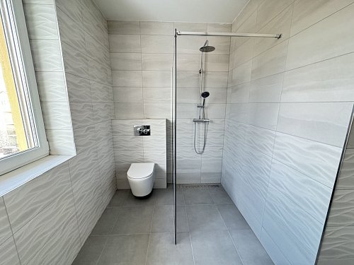 kúpeľňa s obkladmi, dlažbou a sanitou.